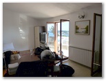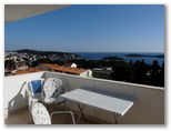 Notre gps Garmin est complètement paumé en arrivant à Hvar. Des nuées de vieilles nous proposent des chambres. On se retrouve dans des petites rues sinueuses en cul de sac, en sens interdit, perdus! heureusement une dame dans un anglais impeccable (trop) nous remettra sur le bon chemin qui est beaucoup plus bas. Ensuite ca reste compliqué, le gps veut nous faire passer par la grande place interdite aux voitures. En fait il faut contourner la ville et la prendre à l'envers pour y pénétrer avec une rue en sens unique qui en fait le tour comme la coquille d'un escargot. Enfin on trouve la maison "apartmani Rogosic" Les propriétaires nous attendaient et nous accueillent dans la rue, sympa. L'appart est super grand et bien équipé La vue est fantastique sur la ville et les îles.