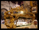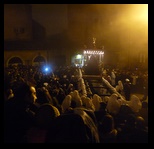Enfin vers 20H les porteurs s'agitent. Un chef crie des ordres et le cortège s'ébranle. Ils tiennent le traineau du Christ par une petite cordelette accrochée au poignet. Ils sont bien une quarantaine. Après la sortie du Duomo ils lèvent le traineau et le portent sur leurs épaules. Ils avancent d'un pas chaloupé au rythme de la musique et déambulent dans les rues jusqu'au bout de la nuit.